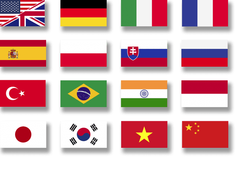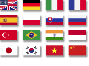 Current languages: English, German, Italian, French, Spanish, Polish, Slovak, Russian, Turkish, Portoguese, Indian, Indonesian, Japanese, Korean, Vietnamese, Chinese